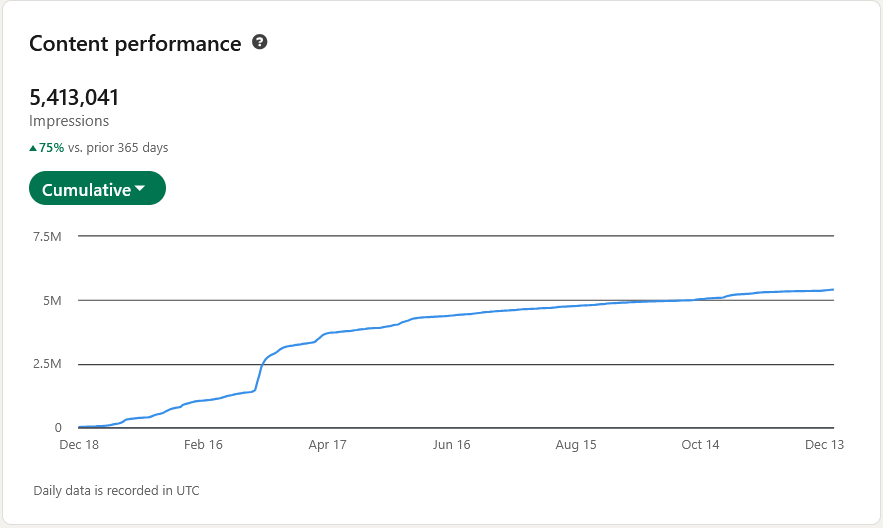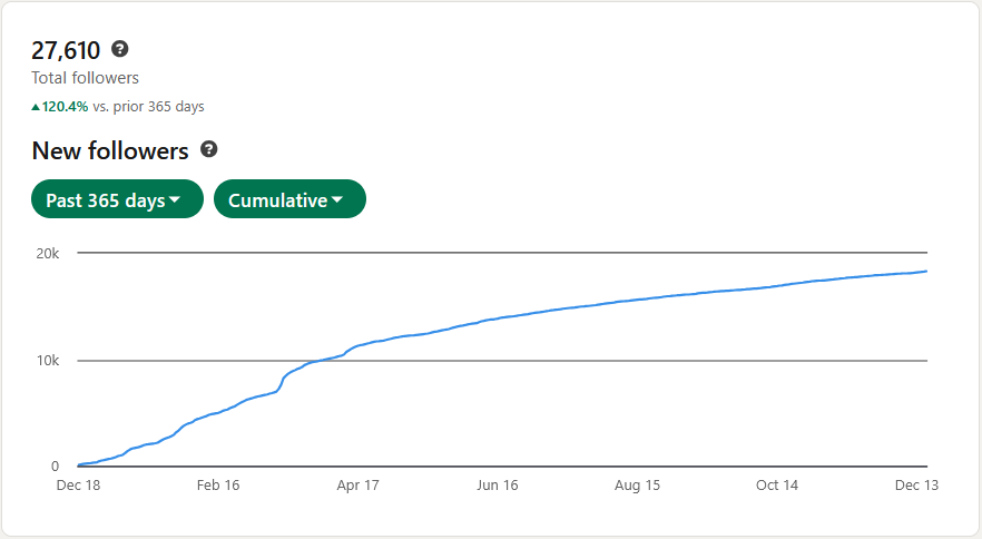 My LinkedIn presence exploded this year, welcoming 19,318 new followers (120.4% growth) to bring my total following to 27,610 and generating a whopping 5,413,041 impressions in 2025.