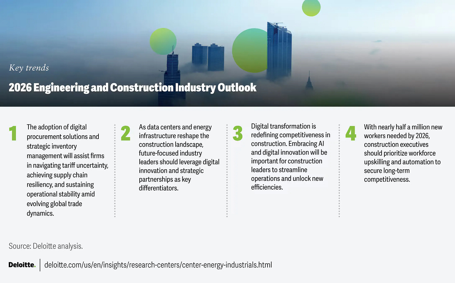Deloitte identified four major trends hitting the construction industry in 2026. These aren’t just macro trends to be aware of. They’re operational realities you need to manage this week.